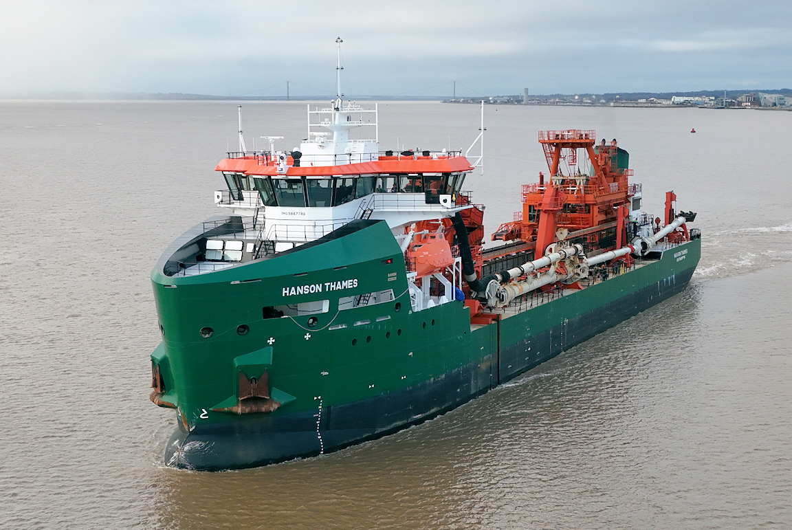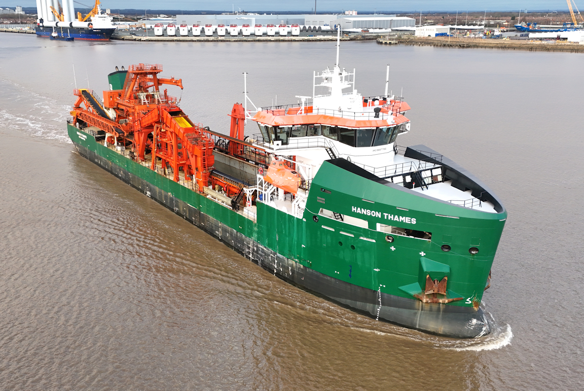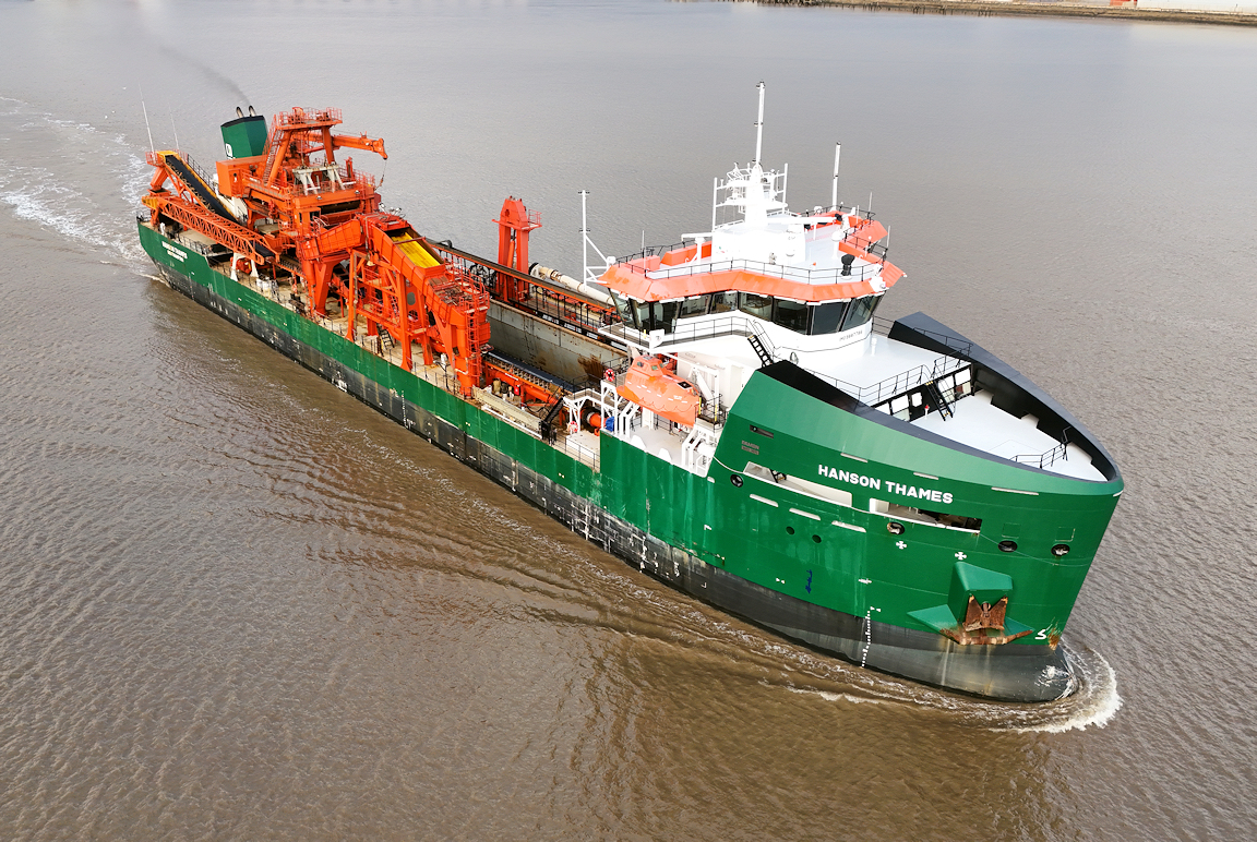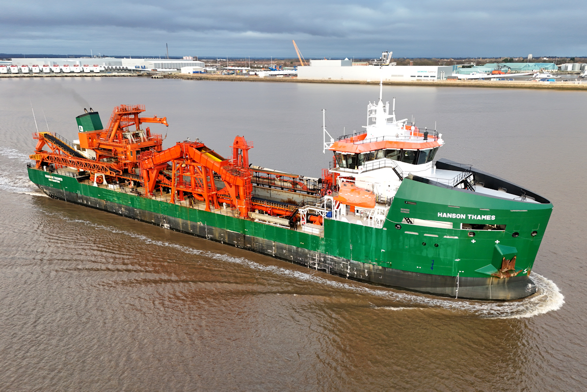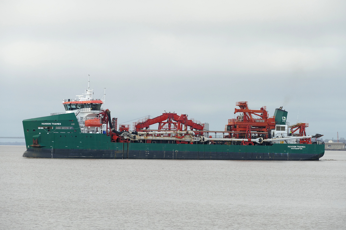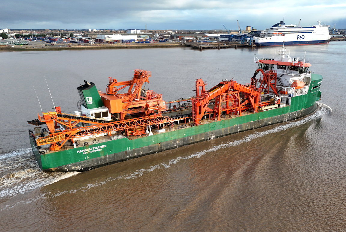 Still grey as the rare visitor to Hull the aggregate dredger HANSON THAMES sails from Alexandra dock.