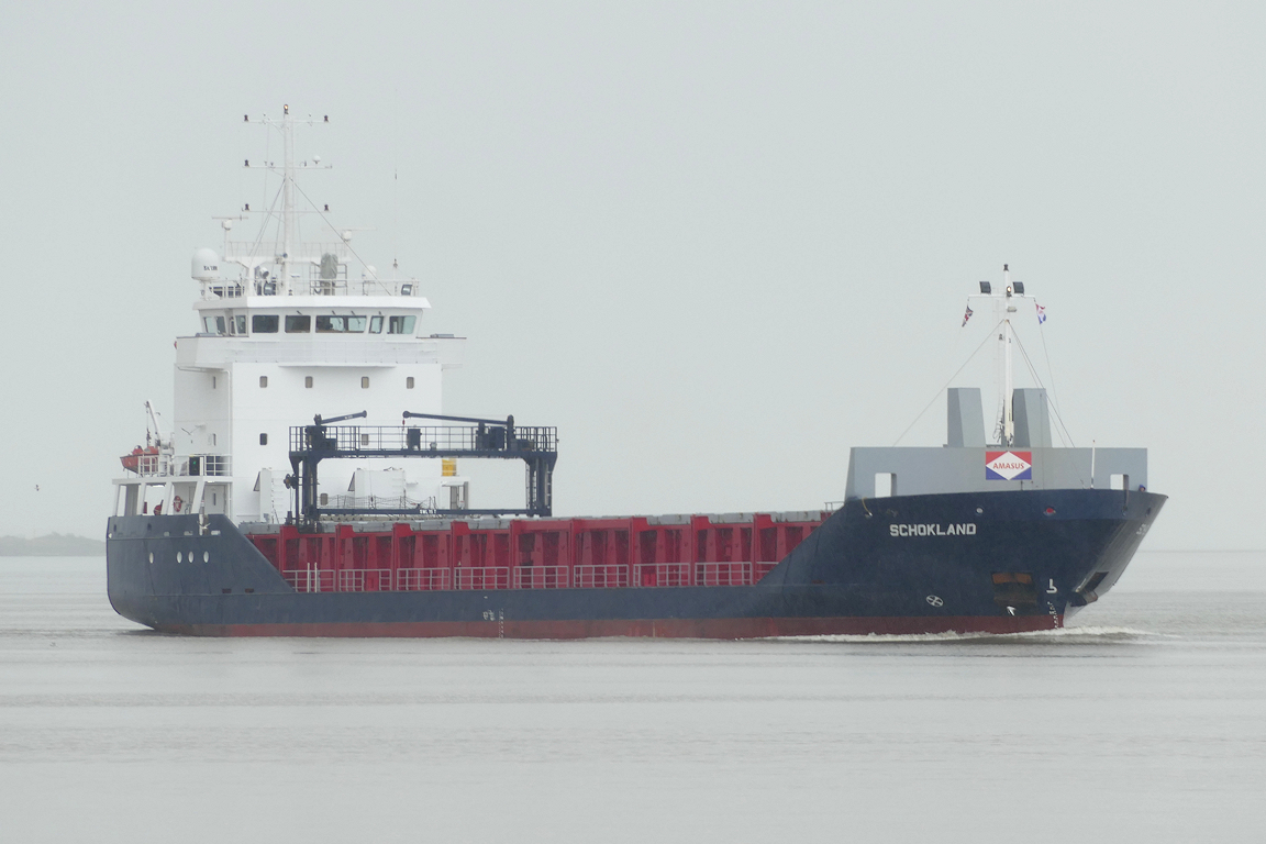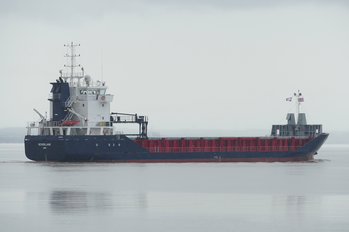 On a grey and rainy afternoon, SCHOKLAND passes King George dock for Albert dock.